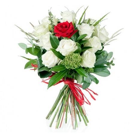 12 pink carnation, 10 white roses and 1 bunch of pink hydrangeas in a bouquet